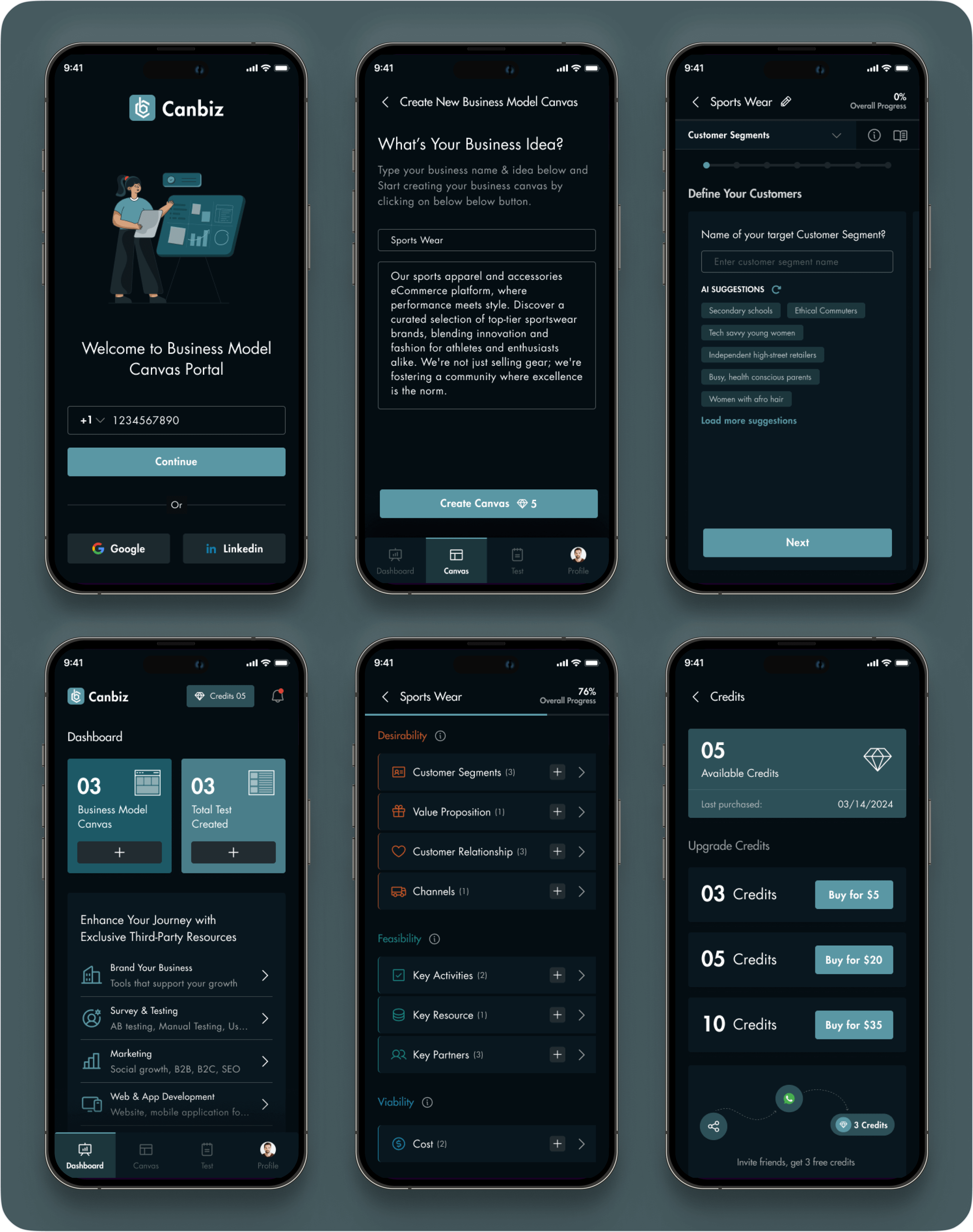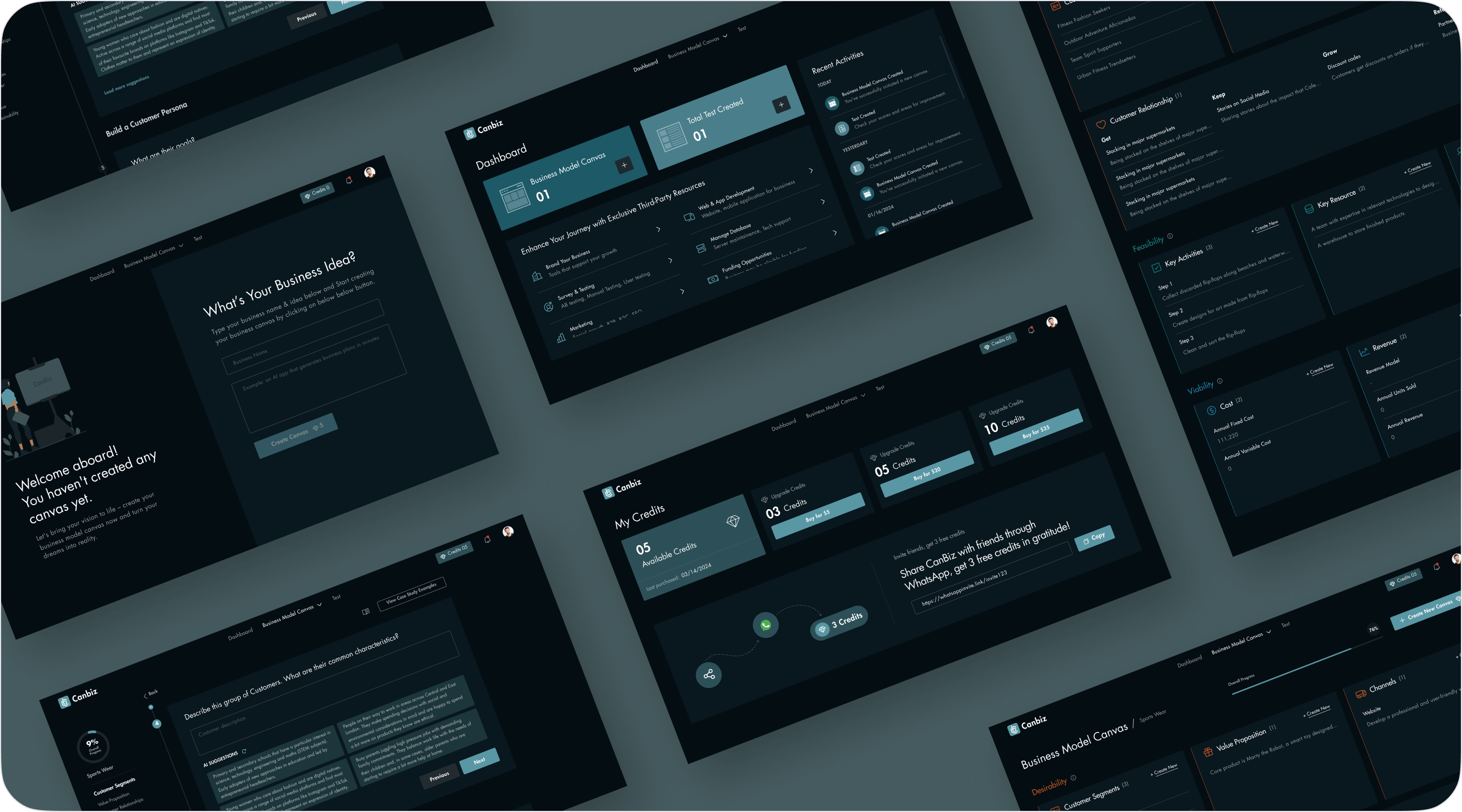 Design a new logo for Canbiz, create a user-friendly, mobile-optimized interface with a sleek dark theme, and implement a clear onboarding process to guide users through the BMC framework. AI will provide personalized insights, and educational resources like tutorials and case studies will enhance user support, with potential partnerships for added resources and community access also considered.